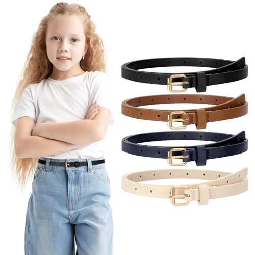 4 Pack Girls Skinny Leather Belts for Jeans Dress Thin Waist Belts for Girl with Gold Buckle 4