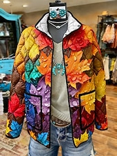 More information about Women's Winter Jacket Quilted Jacket Warm Lightweight Buttons Print Active Vintage Artistic Casual Leaf Casual Regular Stand Collar Regular Fit Long Sleeve Outerwear Orange Fall Winter
