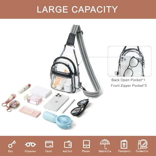 • ✓Large Capacity:This Clear Crossbody Purses sling Bag comes in 3 front zipper pockets and 1 open back pocket.It is very spacious and practical.commodious enough to hold your essentials,entrance tickets,wallet,phone,power bank,small fans,earphones,wet wipes,keys,sunglasses,makeup and so on.different size pocket to organize your things well without bulky.