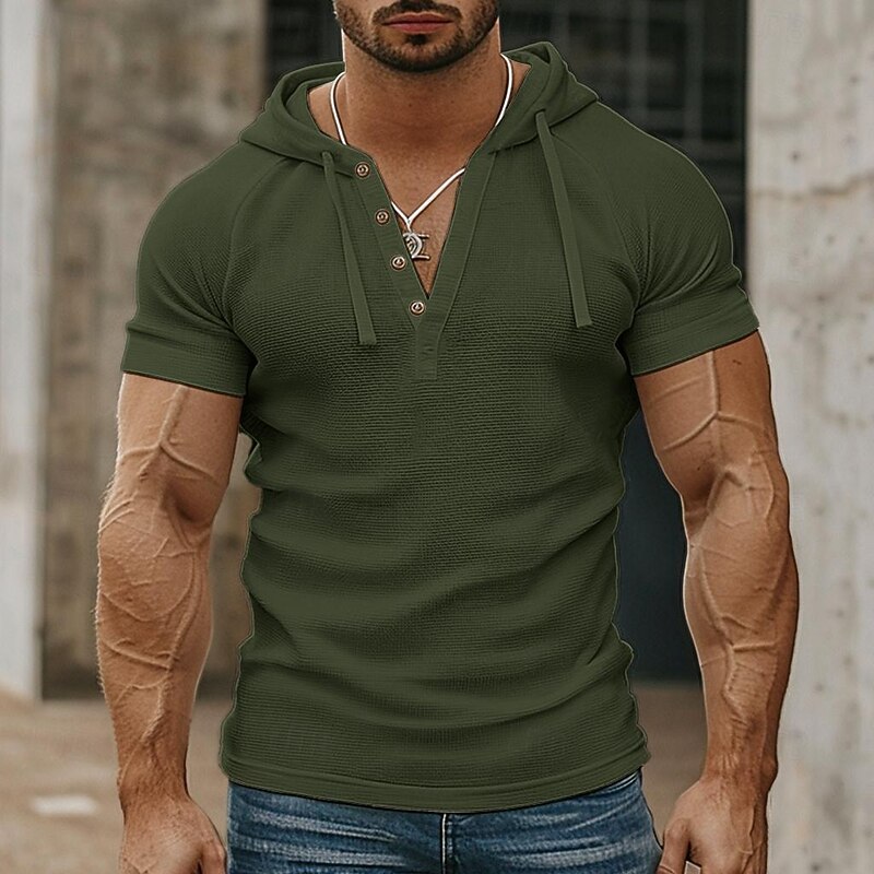 Men's Waffle Knit Tee Tee Top Short Sleeve Hooded Summer Solid Color Daily Casual Buttons Hooded Outdoor Street Causal Army Green White Khaki Top Tee for Men