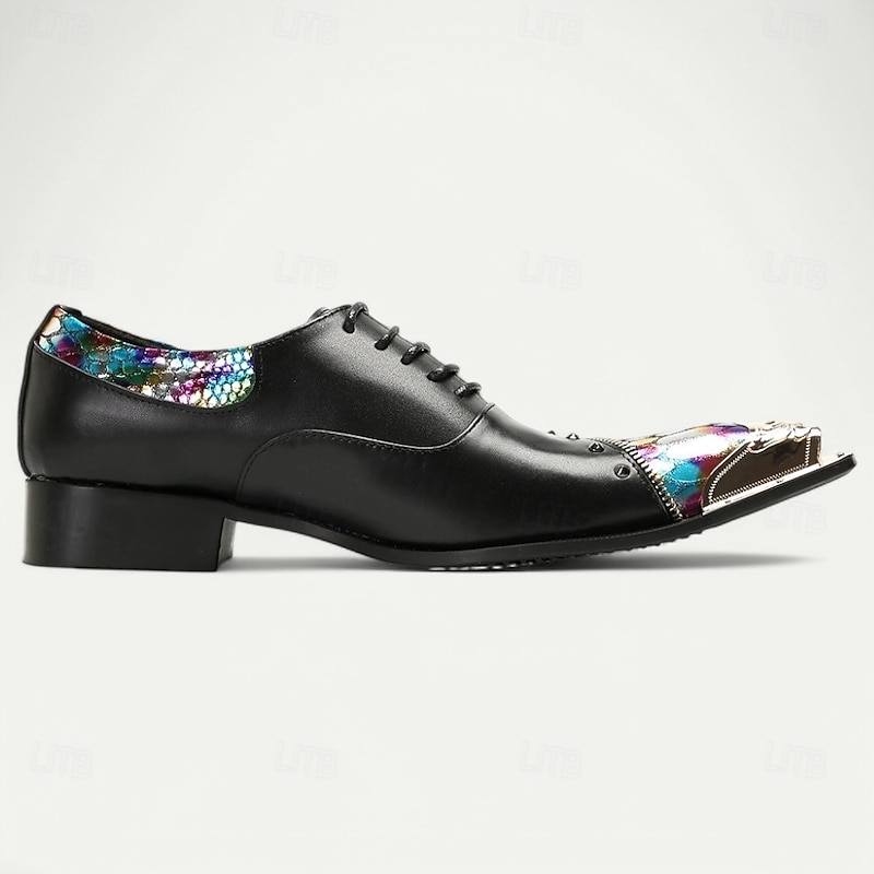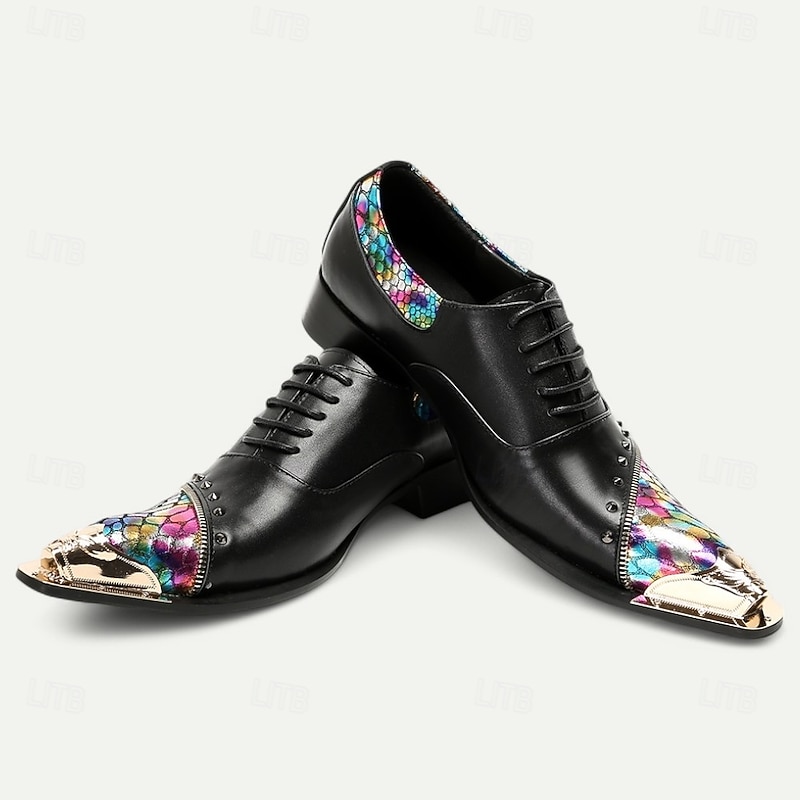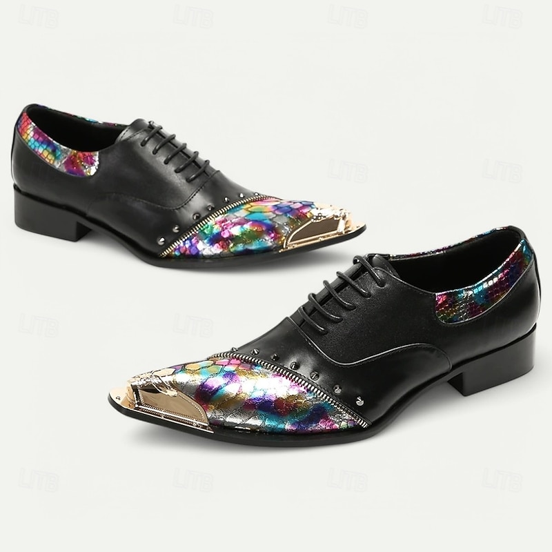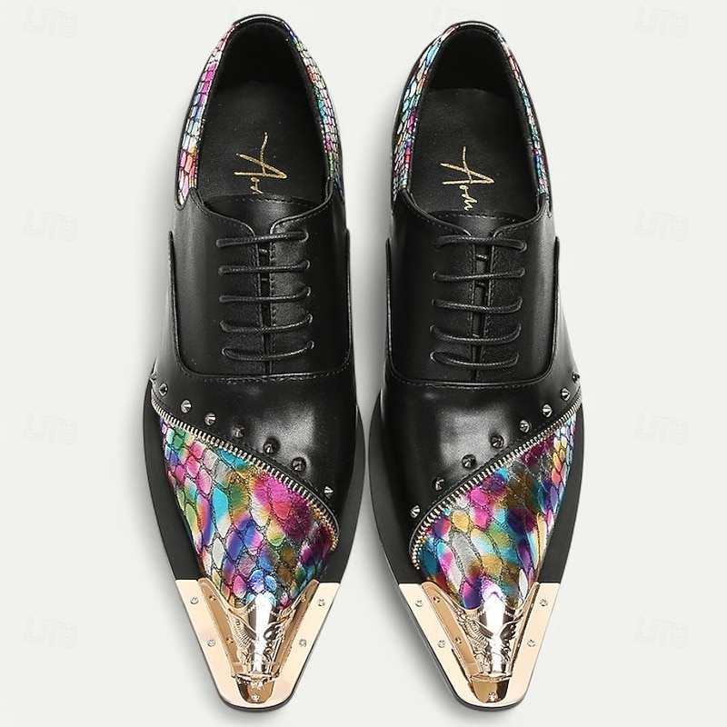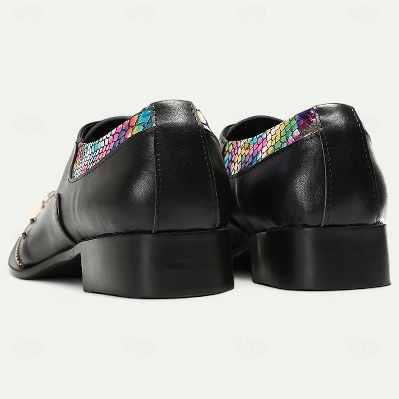 HOT ! Men's Premium Black Leather Dress Shoes with Gold Tip Multicolor Snake-Pattern and Studded Detail–Stylish Formal Footwear for Special Occasions