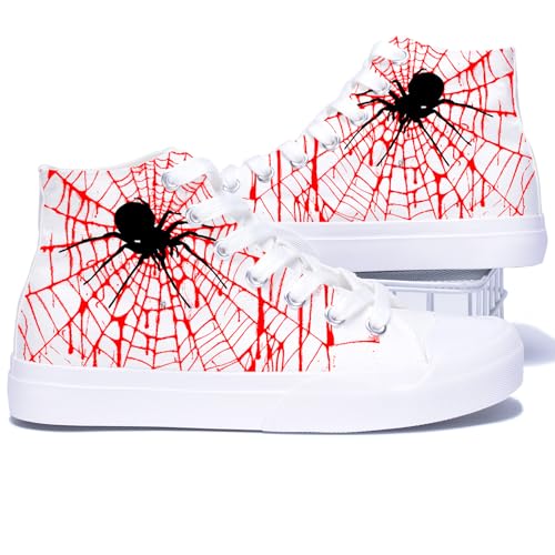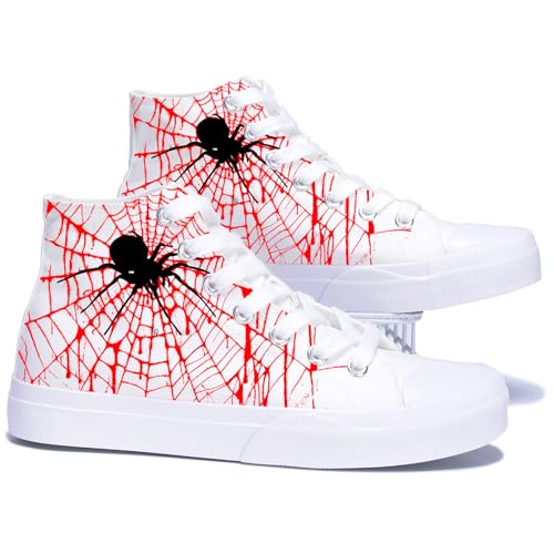 • DESIGN: High-top canvas sneakers featuring striking red spider web pattern on black background with spider motif for a bold, unique look