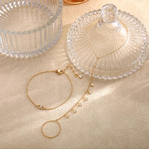 • GOLD HAND CHAIN BRACELET: Dainty bracelets have a trendy and delicate design, which are studded with sparkling Cubic Zirconia and Pearl. Our fashion unique hand jewelry is perfect for your daily life and parties, adding elegance and charm