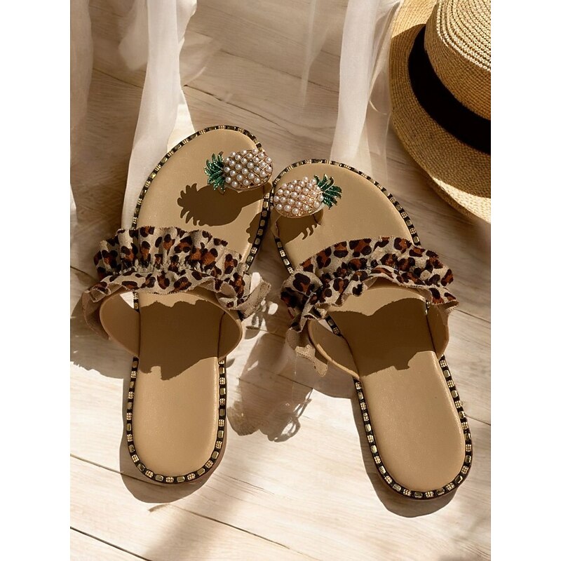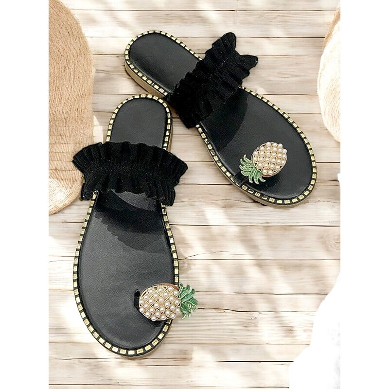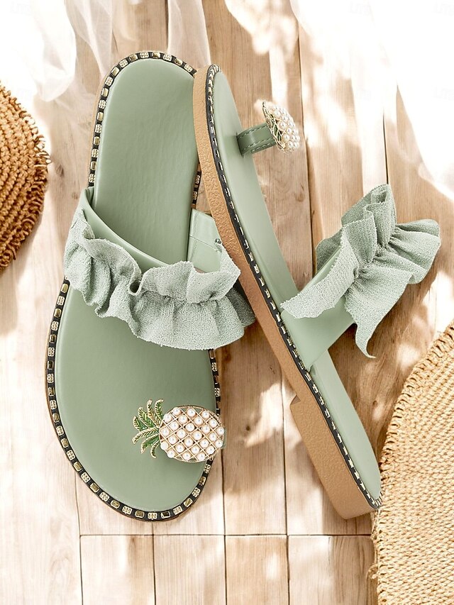 HOT ! Green Ruffled Slide Sandals for Women – Stylish Pearl Pineapple Detail, Comfortable Flat Sandals for Summer, Beach and Casual Wear