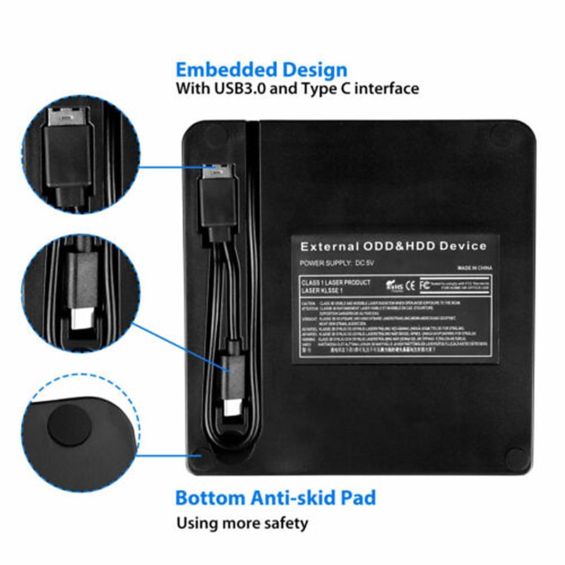 Highlights 1. Easy Plug and Play: No external driver or power supply needed! Just plug it into your USB port and start using our external DVD burner. 2. High Speed Technology: Our CD-ROM External Drive supports DVD+R, DVD, CD-ROM, DVD-ROM, CD-R, CD-RW. With USB3.0 and Type C Interface, it brings faster data transmission speed (max 5Gbps), while playing music and movies without any distortion or lag! 3. Wide Compatibility: Our External CD/DVD drive is compatible with Windows 10 /8.1/7/XP/Vista, Linux, and all versions of Mac OS. Perfect for APPLE / DELL / SONY / SAMSUNG / ASUS / ACER / HP, and other notebook, Ultrabook, PC, desktops that lack built-in drive hardware. 4. Portable Design: The slim and compact design with a fashionable and scratch-proof exterior makes it highly portable! Easily slip it in your travel bag and take it with you anywhere, anytime. 5. Multifunctional Optical Drive: Our intelligent burning technology allows you to read, write, and burn discs, or even interrupt recording at your convenience. The pop-up button and disc tray design make it convenient to use. Plug it into the back panel USB port for desktop use!