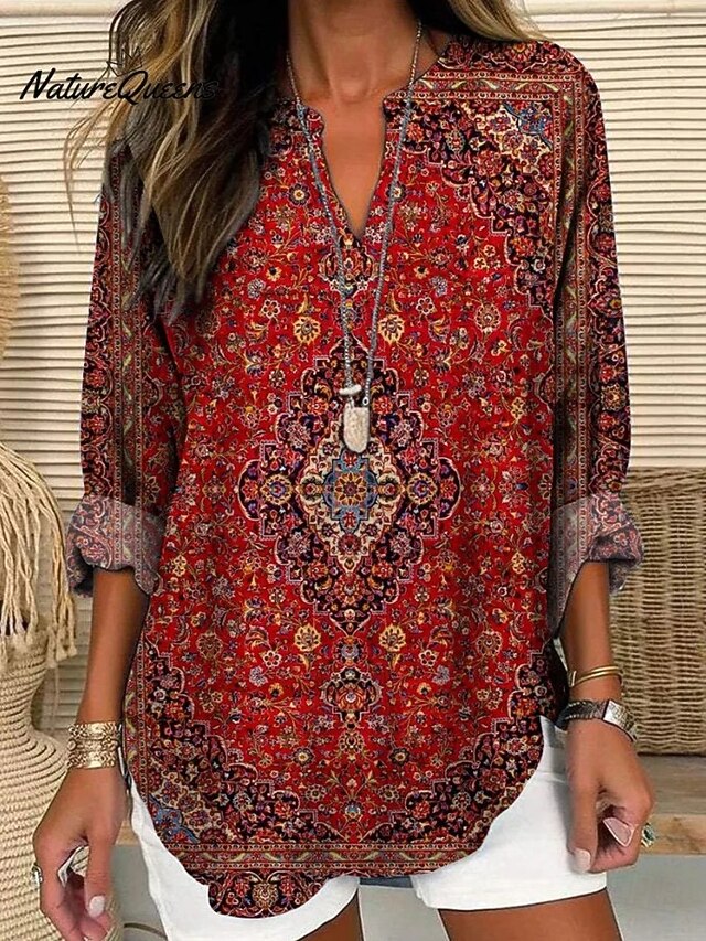 Women's Blouse Tunic V Neck Long Sleeve Boho Casual Ombre Graphic Geometric Vintage Daily Stylish Regular Tops Daily Print White Blue Sky Blue Light Purple Purple Fall 15