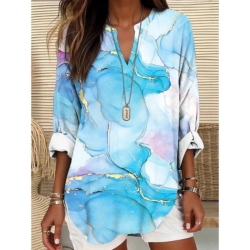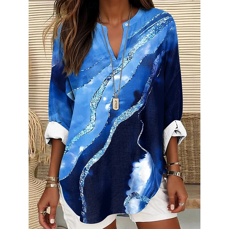 Women's Blouse Tunic V Neck Long Sleeve Boho Casual Ombre Graphic Geometric Vintage Daily Stylish Regular Tops Daily Print White Blue Sky Blue Light Purple Purple Fall 10