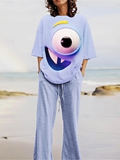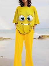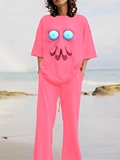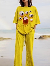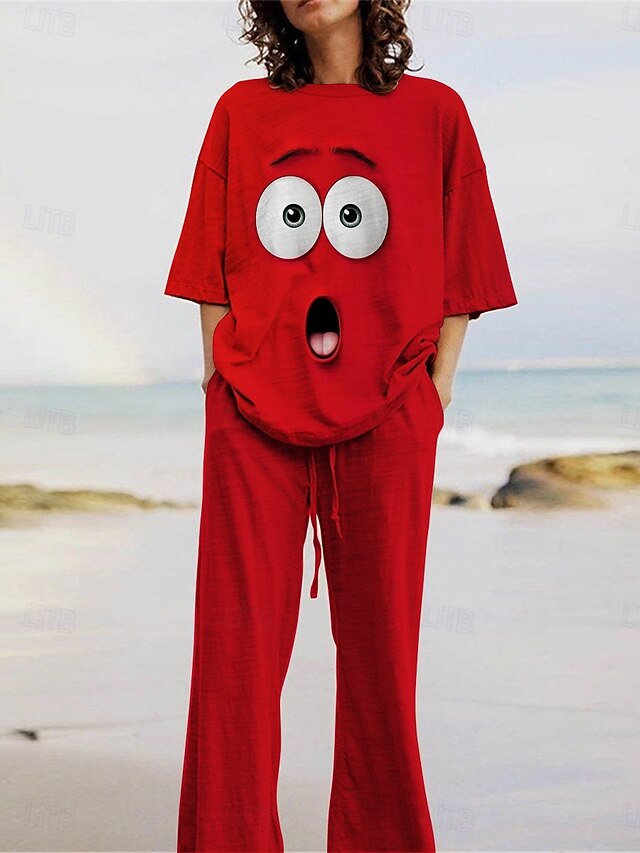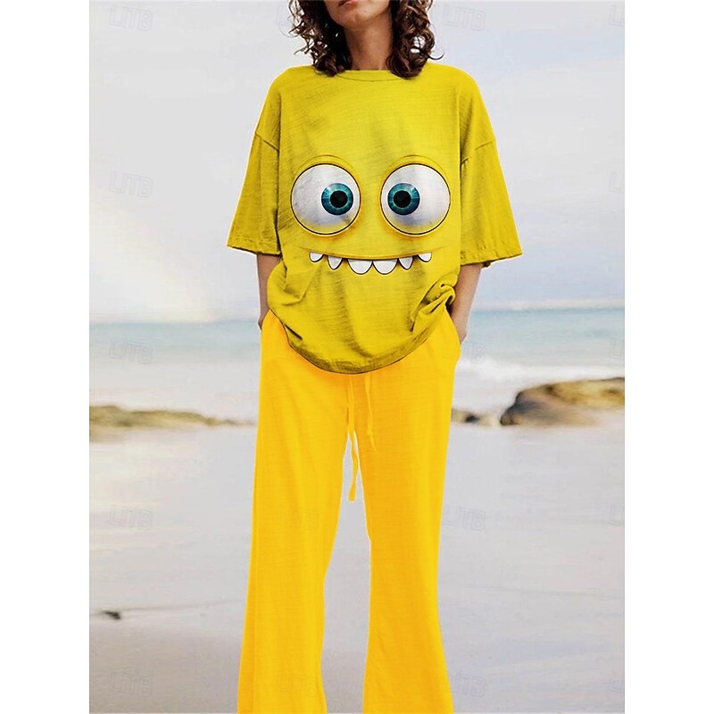 More information about Women's Cartoon Funny Smile Face Pants Sets 3/4 Length Sleeve Crew Neck 3D Print Print Vacation Daily Holiday Yellow Pink Red Summer Regular Fit