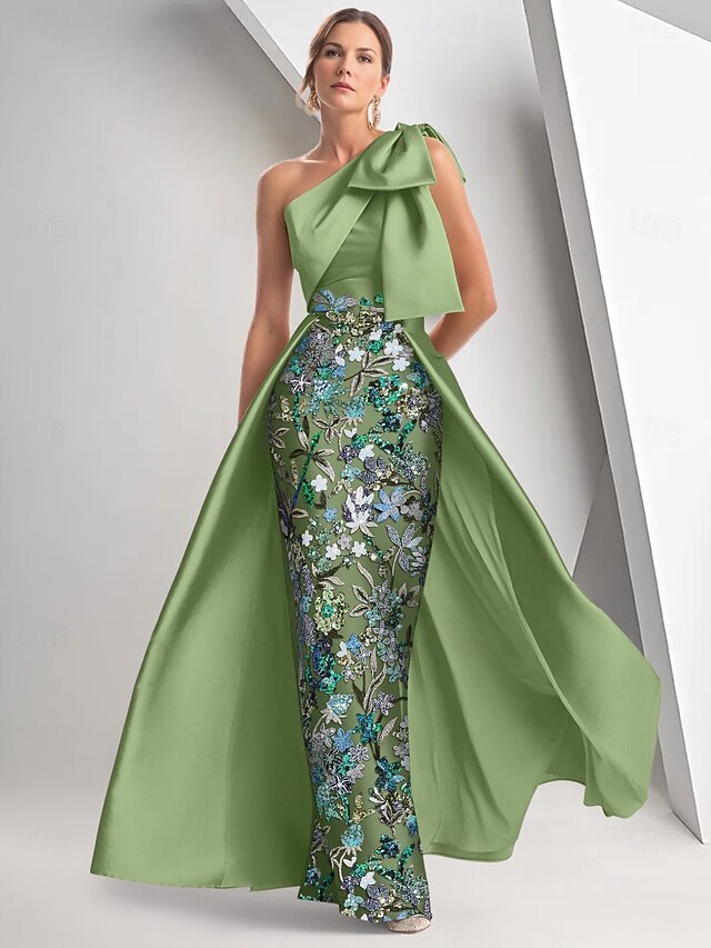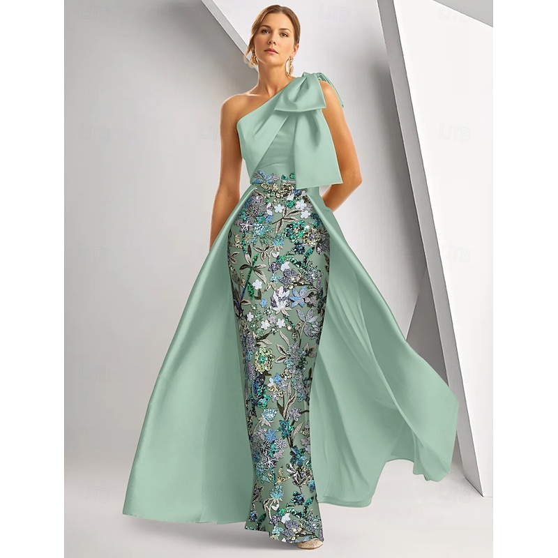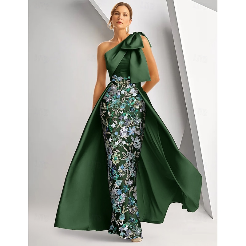A-Line Evening Gown Elegant Dress Formal Wedding Ball Gown Floor Length Sleeveless One Shoulder Satin with Bow(s) Slit Embroidery 1