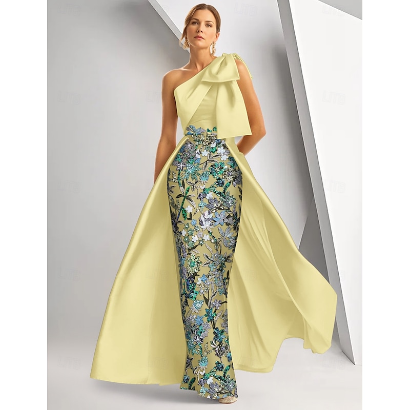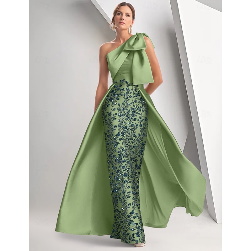 A-Line Evening Gown Elegant Dress Formal Wedding Ball Gown Floor Length Sleeveless One Shoulder Satin with Bow(s) Slit Embroidery 42