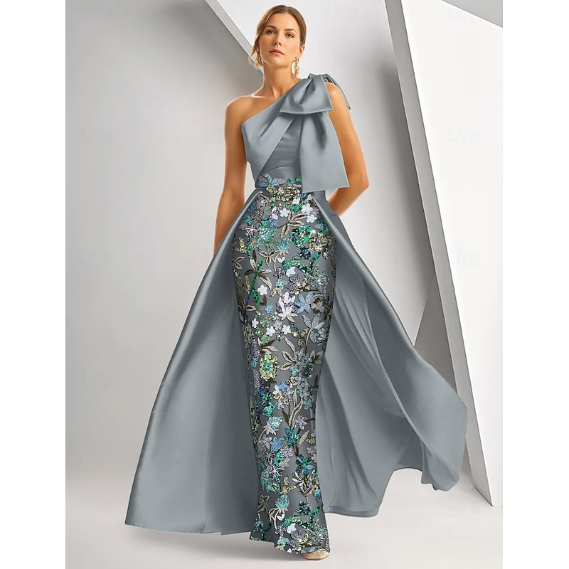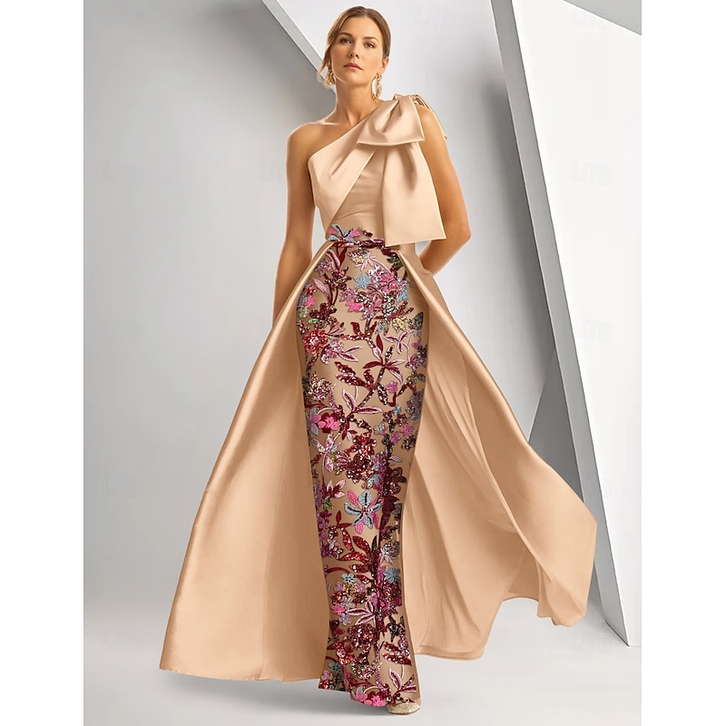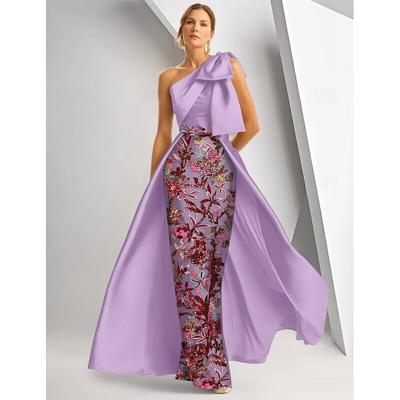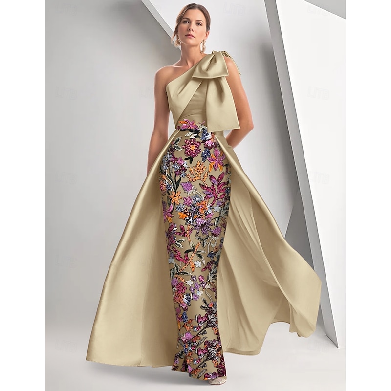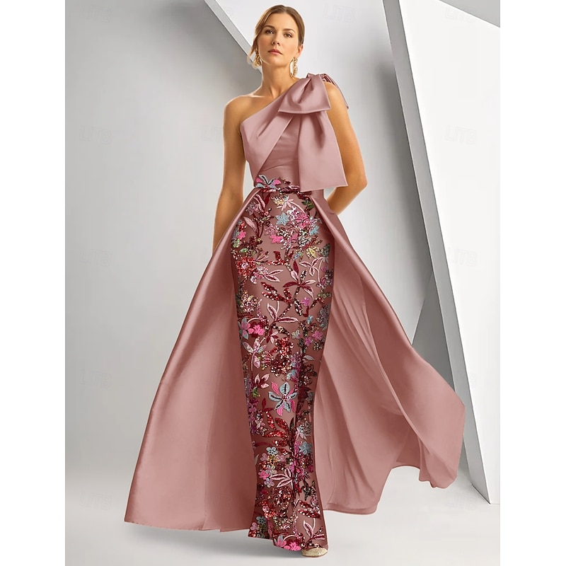 More information about A-Line Evening Gown Elegant Dress Formal Wedding Ball Gown Floor Length Sleeveless One Shoulder Satin with Bow(s) Slit Embroidery