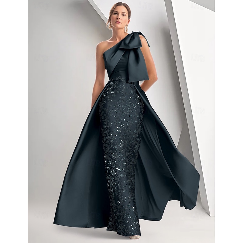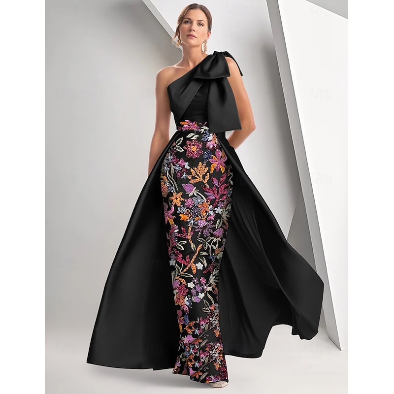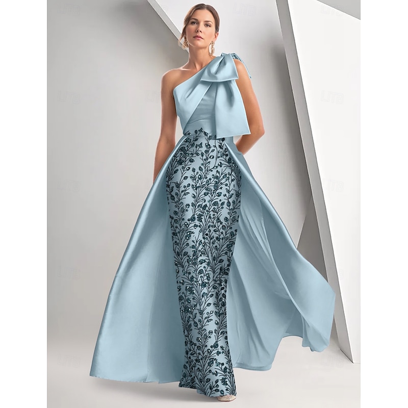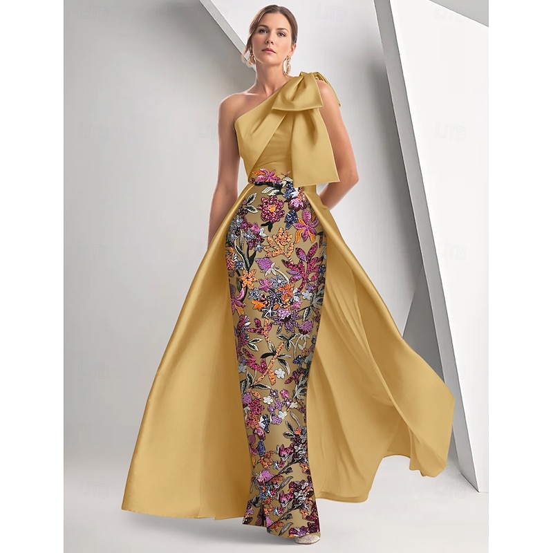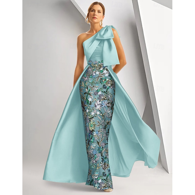 More information about A-Line Evening Gown Elegant Dress Formal Wedding Ball Gown Floor Length Sleeveless One Shoulder Satin with Bow(s) Slit Embroidery