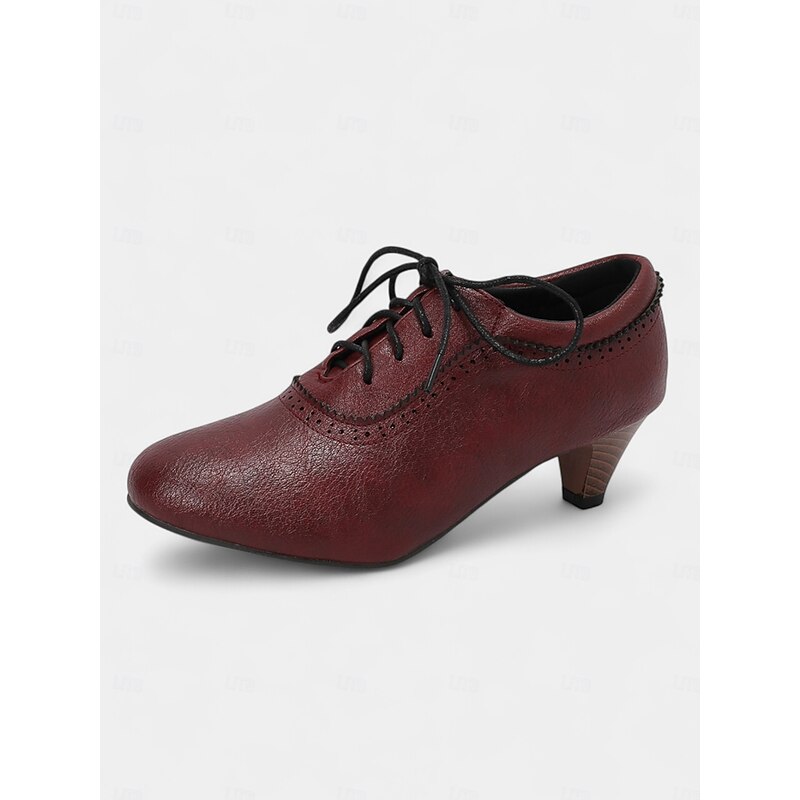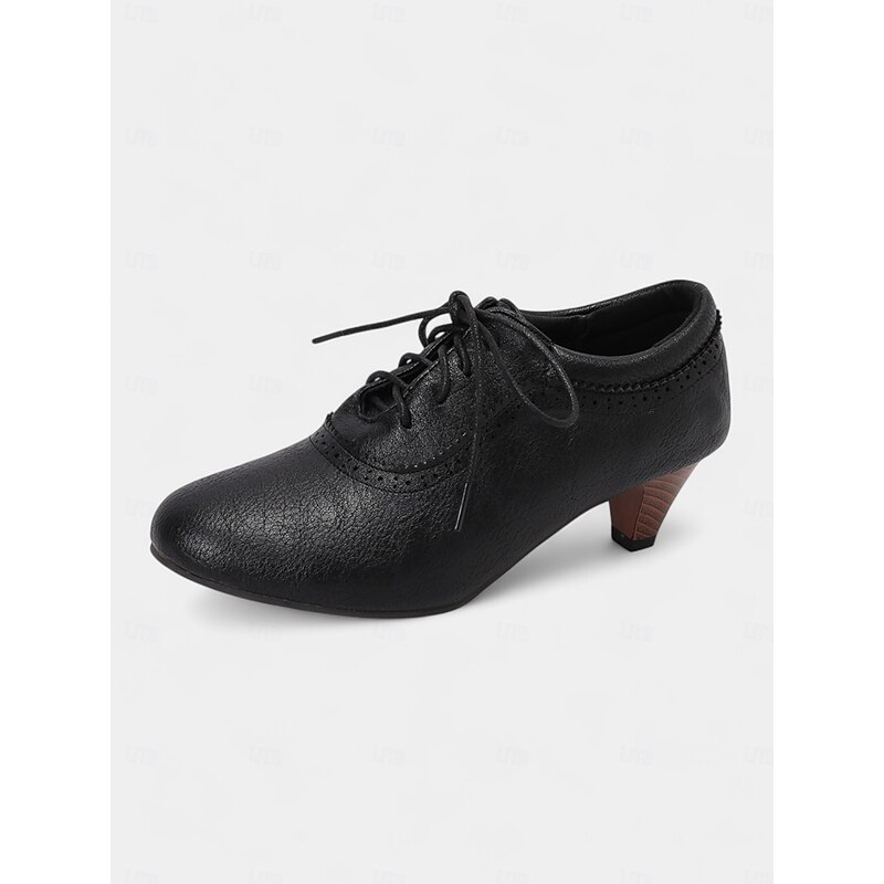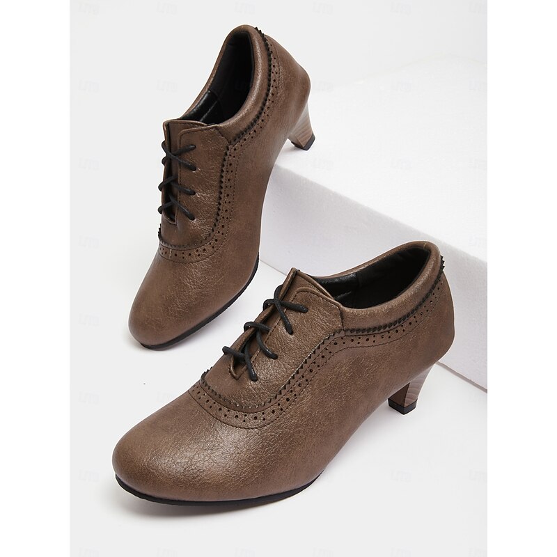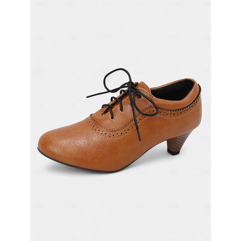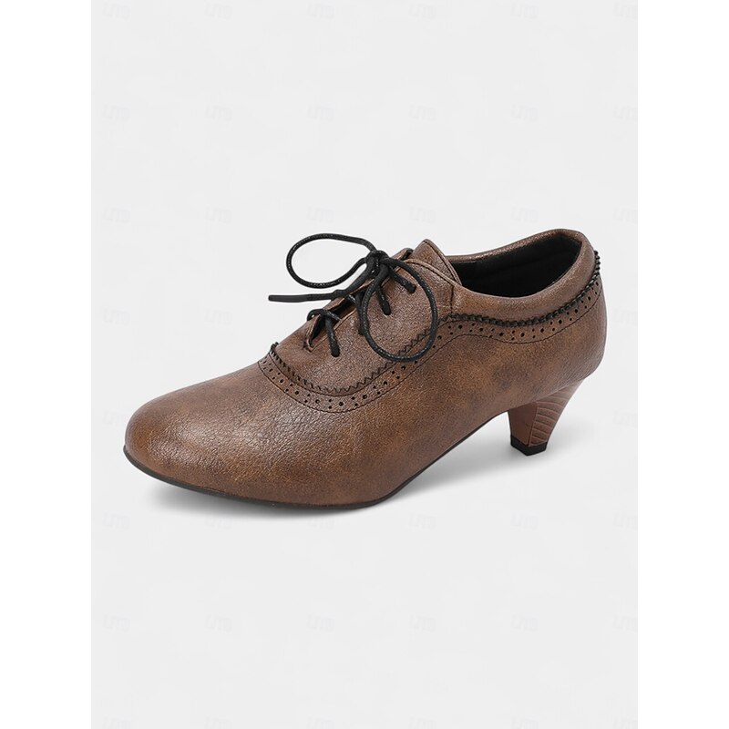 Women's Brown Lace-Up Oxford Heels with Low Block Heel and Brogue Detailing, 1950s Vintage Edwardian Style Dress Shoes for Cosplay, Retro Parties & Daily Fashion Outfits 1