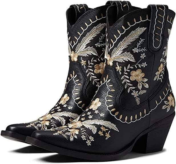 More information about Embroidery Floral Western Boots Square Toe Block Heel Cowboy Cowgirl Boots Vintage Soft Leather Chunky Low Heel Ankle Boots Short Boots Fashion Booties
