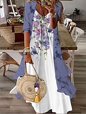 Highlights [Fabric] : Crafted from lightweight polyester, this women's dress ensures comfort and breathability, making it ideal for warmer spring and summer days. The micro-elastic fabric allows for ease of movement, providing a comfortable fit throughout the day. [Fit] : Featuring a regular fit, this long maxi dress flatters the natural shape, enhancing femininity with its elegantly flowing silhouette. The 3/4 length sleeves and V-neck design create a balanced and stylish look for daily wear. [Design Highlights] : The dress is adorned with a beautiful floral print, providing a touch of nature-inspired elegance. The charming print adds vividness and character, while the sleeveless design paired with a delicate blue cover-up jacket offers versatility. The bohemian and chic style perfectly captures a casual yet sophisticated aesthetic. [Occasions] : Suitable for various occasions, this dress is perfect for vacations, daily outings, or outdoor events. Whether you're going out for a leisurely stroll or a casual gathering, this dress complements any activity with its fashionable and mature appeal. [Size Notice] : Available in a range of sizes from S to 3XL, this dress caters to different body types, offering an inclusive fit for everyone seeking style and comfort.
