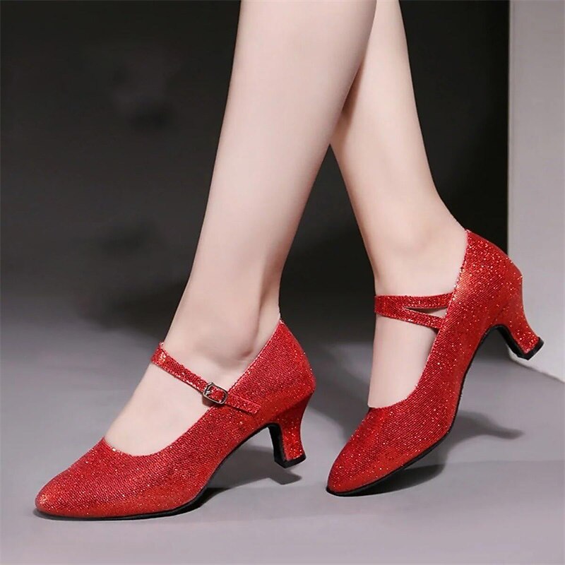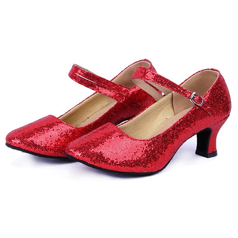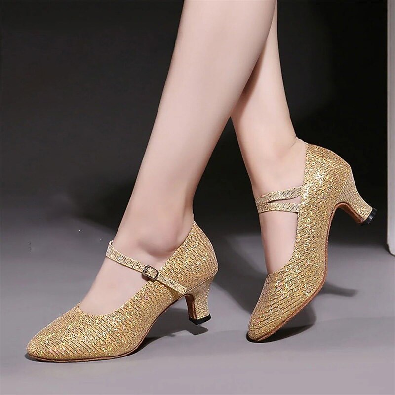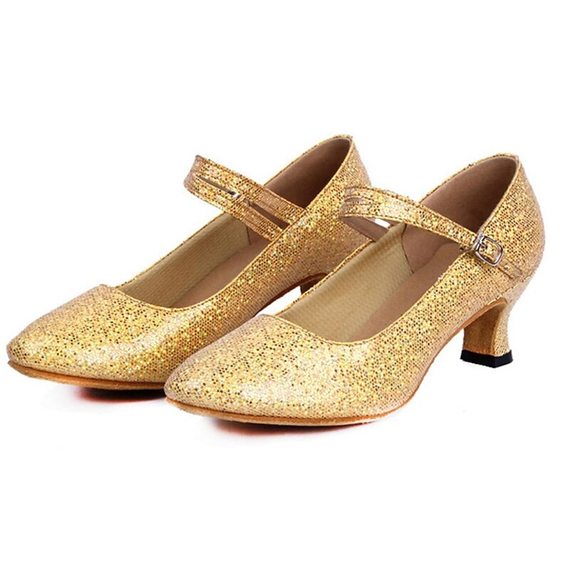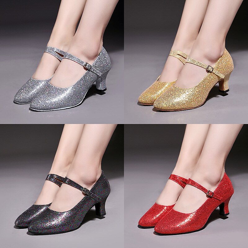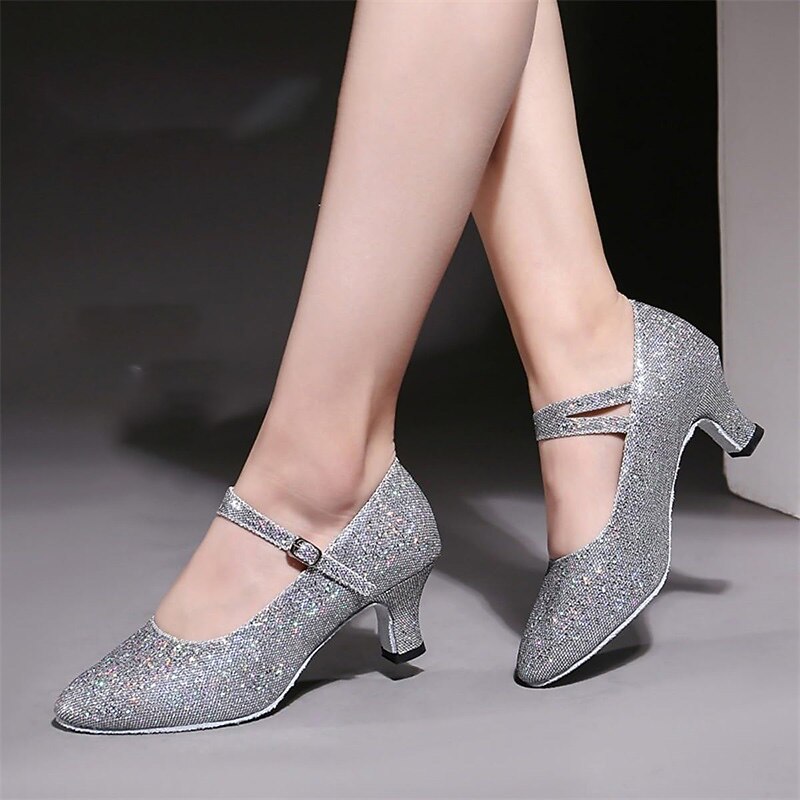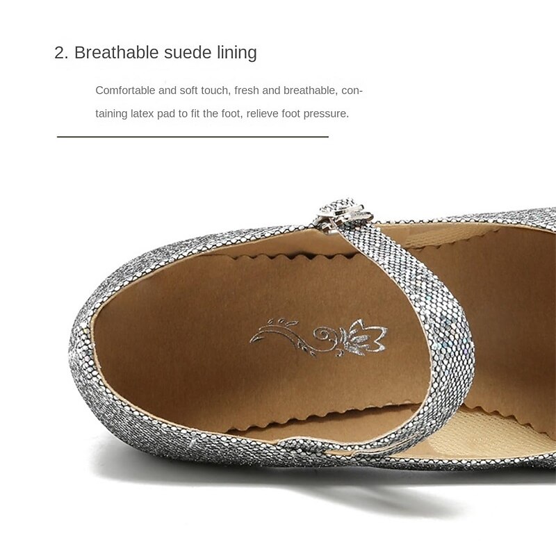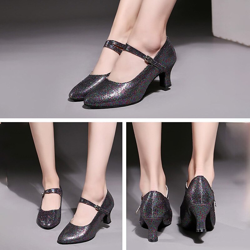Highlights [Fabric and Materials] : Crafted with high-quality artificial leather and sparkling glitter, these ballroom dance shoes provide a dazzling and glamorous look. The fabric lining ensures comfort while maintaining a sophisticated appearance, perfect for long hours of performance or training. [Design and Fit] : Featuring a classic Mary Jane style, the shoes are equipped with a secure ankle strap and an elegant buckle for an adjustable fit. The shoes incorporate a mid-height Cuban heel, offering the perfect balance between elegance and comfort. A round toe design ensures ample space for comfort during extensive wear. [Design Highlights] : These shoes are adorned with shimmering sequins on the surface, enhancing their sparkle in various lighting conditions. The anti-slip outsole is crafted from leather, ensuring secure footing and stability during movements. [Occasions] : Ideal for formal events, dance performances, training sessions, and parties, these shoes bring a touch of sparkle and style to any occasion. Whether you're on the dance floor or attending a glamorous event, they ensure you stand out. [Size Notice] : Available in a wide range of sizes from US5 to US10, these shoes are designed for women and adults. They fit standard sizes, but for those with wide feet, it is recommended to choose one size up if necessary.