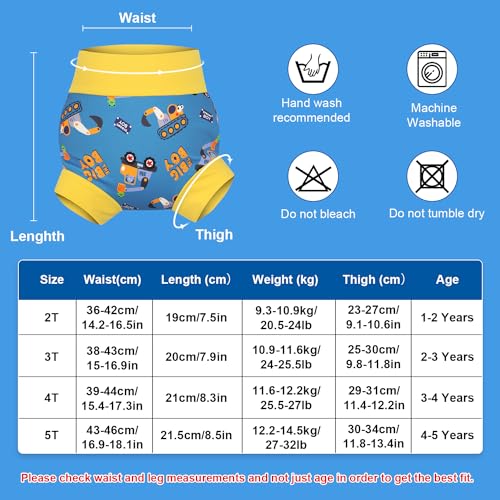 • Size for Swim Diapers: Our waterproof swim diapers have four size. 2T (waist 14.9in, Length 7in, Thigh 9 in), 3T (waist 15.4in, Length 7.8in, Thigh 9.4in), 4T(waist 15.7in, Length 8.3in, Thigh 9.8in), 5T(waist 16.1in, Length 8.7in, Thigh 10.2in).If your baby has chunky thighs, it is recommended to order one size up
