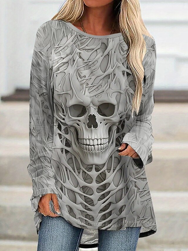 Halloween Women's T Shirt Skulls Graphic Vintage Stylish Casual Long Sleeve Crew Neck Long Tops Daily Print Black Gray Spring Fall 17
