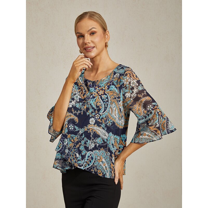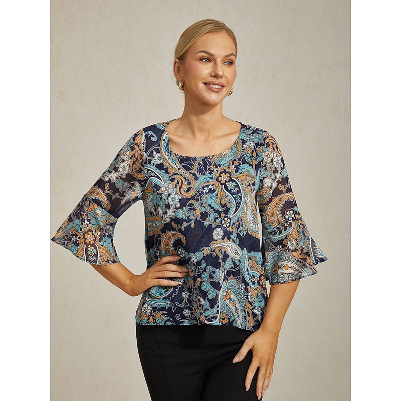 HOT ! Women's Female Paisley Casual Blue Paisley 3/4 Sleeve Elegant Casual Daily Crew Neck Round Summer Spring Fall