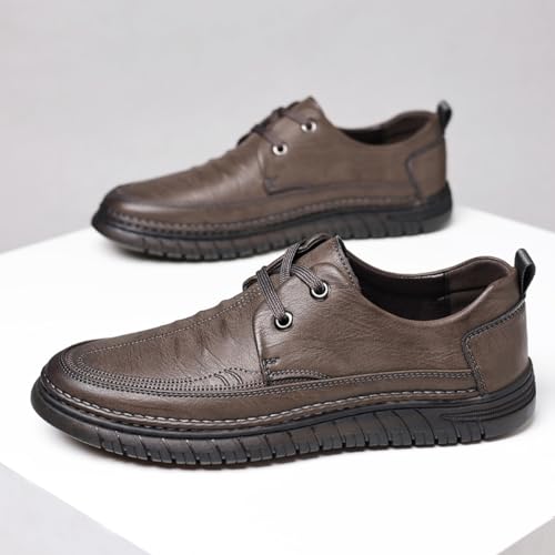 Mens Handmade Leather Lace Up Flats Oxford Shoes Casual Lightweight Low Top Non-Slip Round Toe Walking Driving Loafers Shoes Khaki Black 7