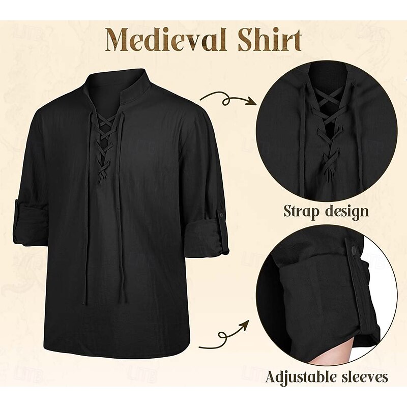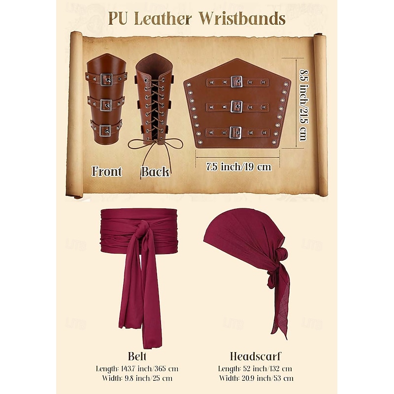 Highlights Complete Medieval Pirate Costume Set: This all-inclusive set features 1 medieval shirt, 1 pair of Gothic pants, 1 pirate vest, 1 pair of leather bracers, 1 headscarf, 1 belt, and 1 eye patch; the accessories are rich and varied, great for fulfilling all your costume and cosplay party needs Excellent Material of Medieval Costume: Crafted from a blend of cotton and linen for the shirt and pirate pants, with a suede viking vest and PU leather bracers, this Halloween men's Renaissance costume set offers durability and comfort; the headscarf and belt use lightweight fabrics, while the earring and eye patch are made from plastic, providing a tender, breathable, and non-restrictive fit ideal for all-day wear Medieval Pirate Design: Featuring an adjustable, drawstring lace-up shirt and pant cuffs, this men's Medieval pirate costume offers a tailored fit; the included headscarf, belt, and accessories complete the authentic medieval pirate look, helping you stand out at Halloween or Renaissance party Multiple Sizes Available: Our men's Medieval pirate costume set comes in 6 sizes ranging from S to 3XL; Accessories are designed in a one-size-fits-most standard, suitable for most adults; please confirm your size and refer to the size chart in the picture before purchasing and please allow for slight differences as our measurements are done manually Wide Range of Uses: Suitable for Halloween, Renaissance festivals, cosplay events, stage performances, pirate themed parties, pirate role-playing, and carnival celebrations; this versatile men's Medieval pirate costume set lets you dive into various characters and settings with style and ease Perfect for everyday use. excellent materials and excellent craftsmanship ensure long-lasting durability.