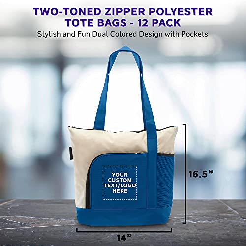 HOT ! DISCOUNT PROMOS 12 Zipper Polyester Tote Bags Set - Customizable Text, Logo - Two-tone, Zipper Closure, Pen Loop - Blue