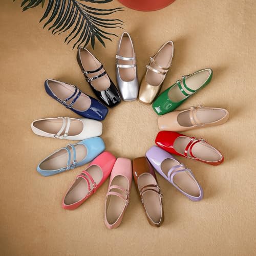 Optigard Women's Patent Leather Mary Jane Flats Comfortable Square Toe Adjustable Double Strap Flat Dress Shoes 5