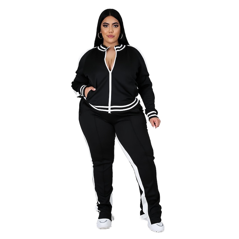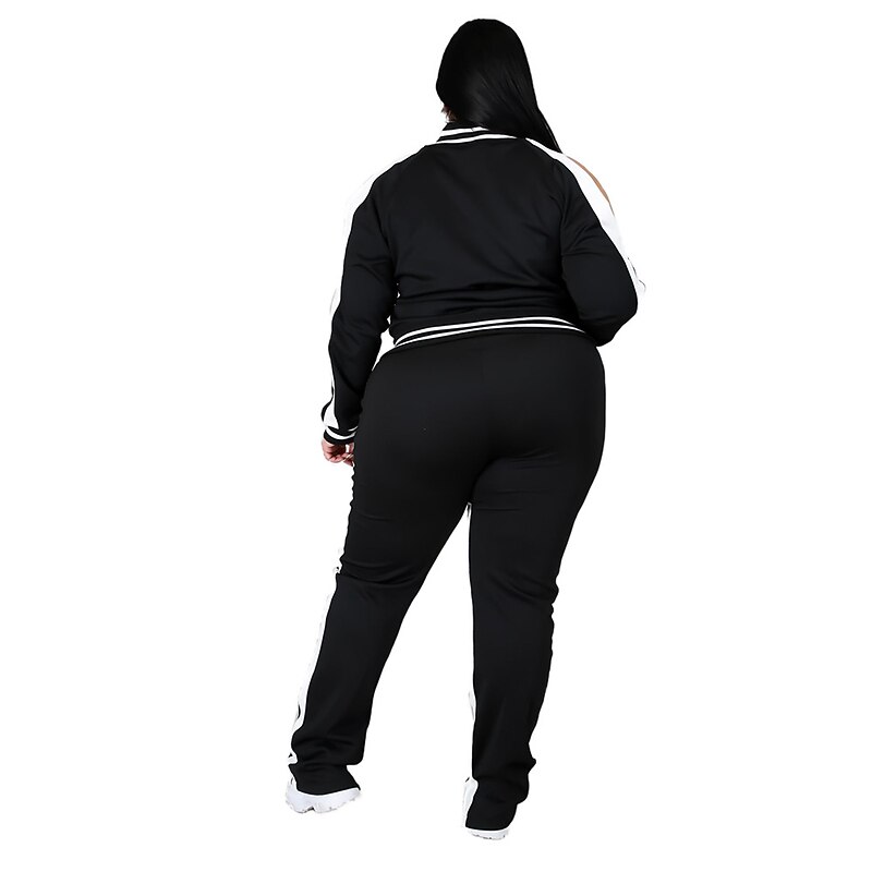 The tracksuit boasts a stand collar zip-up jacket with bold, contrasting stripes and striped ribbed cuffs for a classic athletic look. The matching pants complement the jacket with their sleek design and elastic waistband, making the set both stylish and functional.