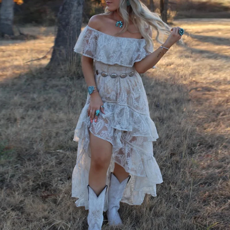 Women Sexy Neck Draped Party Dress Spring Embroidery Lace Ruffle Irregular Summer Off Shoulder Backless Long Dress