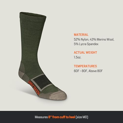 • Versatile 8-inch crew height offers optimal coverage for early season activities, making these moisture-wicking socks essential hunting accessories for warm weather pursuits from food plot work to backcountry elk hunting