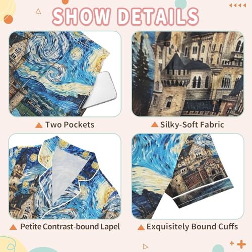 More information about ALAZA Van Gogh Starry Sky European Castle Satin Pajamas Set Short Sleeve Button Down Sleepwear Summer Pjs 2 Piece