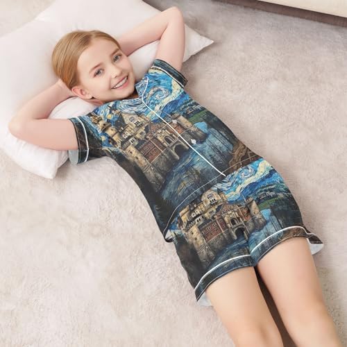 ALAZA Van Gogh Starry Sky European Castle Satin Pajamas Set Short Sleeve Button Down Sleepwear Summer Pjs 2 Piece 1