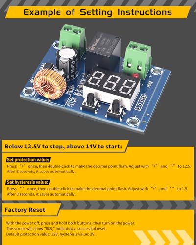 • VOLTAGE THRESHOLD SAFEGUARD: Over-Discharge Protection: This battery management module provides a wide range of adjustability for discharging modes and parameter configurations. Users can define parameters to automatically disconnect the battery upon reaching a preset voltage threshold, effectively preventing over-discharge and prolonging battery lifespan (Important: The relay lacks an integrated power cutoff mechanism. Always manually cut off the power supply post-disconnection; failure to do so will drain the battery to 0V). Its customizable parameters allow precise adaptation of the power management system to unique operational needs and user preferences