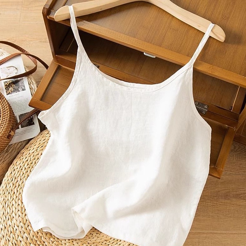 More information about Women's Cotton Linen Vest Blouse Plain Modern Casual Sleeveless Strap Regular Tops Holiday Going out Black White Purple Apricot Summer