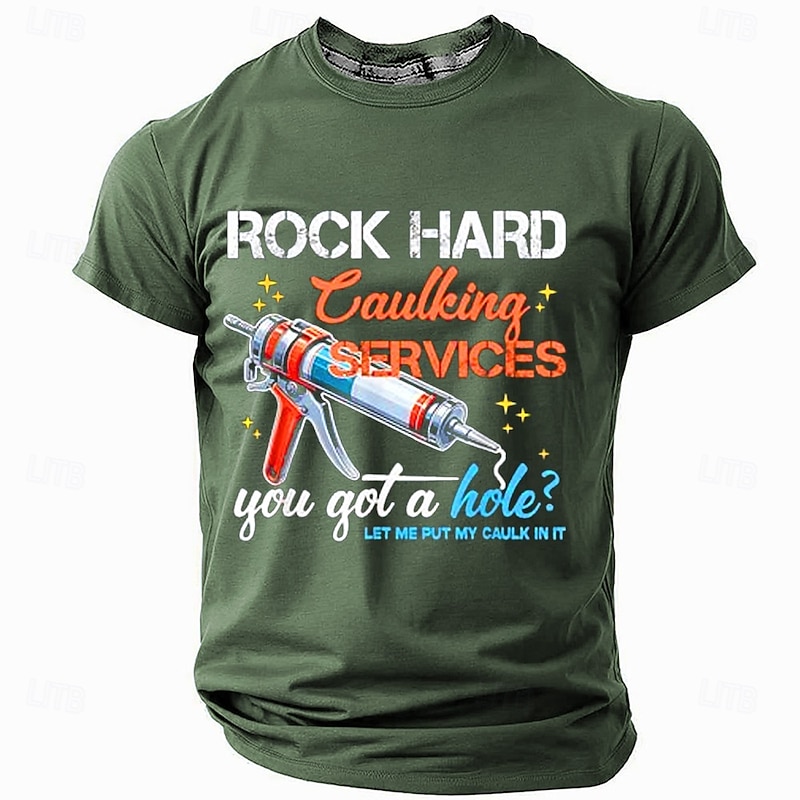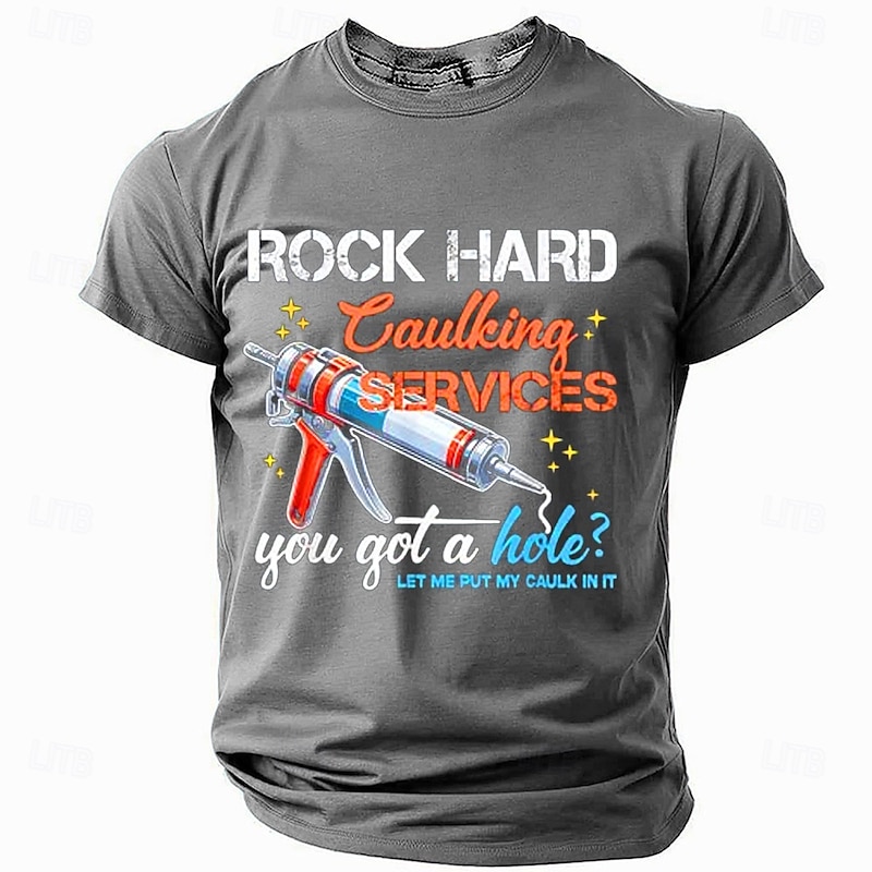 Men's Graphic T-Shirt, Funny Pun Short Sleeve Tee with 'Rock Hard Caulking Services, Got A Hole? Let Me Put My Caulk In It' Slogan 1