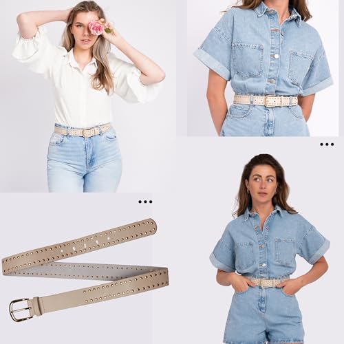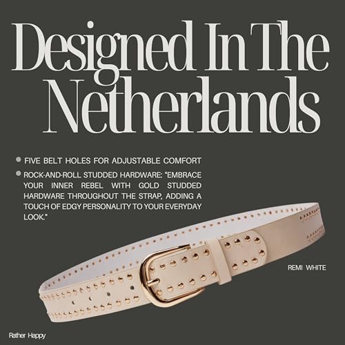 • ✅ VERSATILE DESIGN: This skinny belt features a gold buckle and gold studded hardware adorned all over the leather strap.Choose between our white belt women or black belt for women, to create a style suitable for a formal occasion and casual outing.