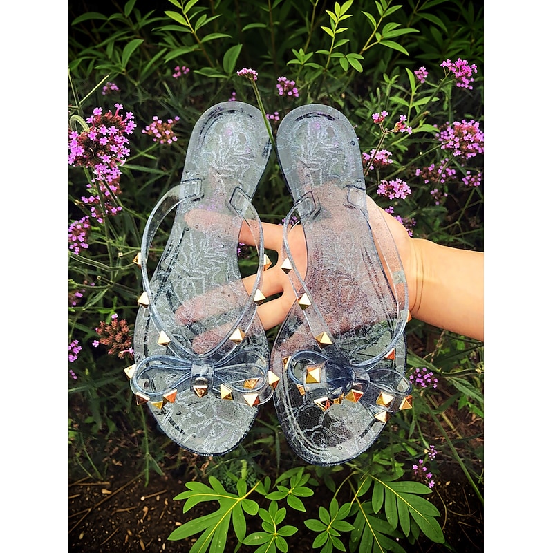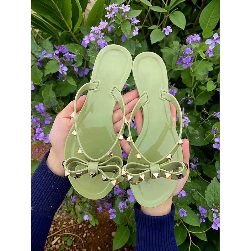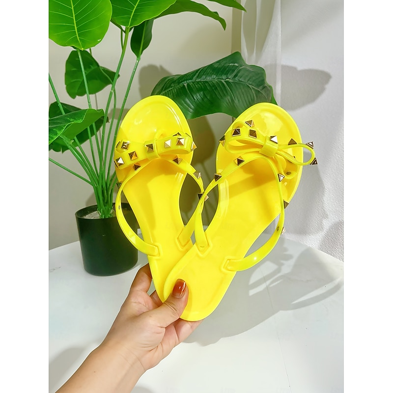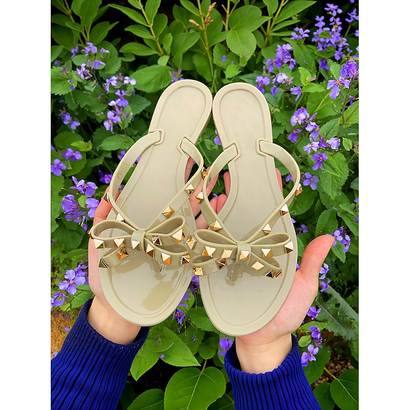 HOT ! Women's Black Studded Bow Flip-Flops – Chic Beach Sandals with Comfortable Flat Sole for Summer Casual Wear