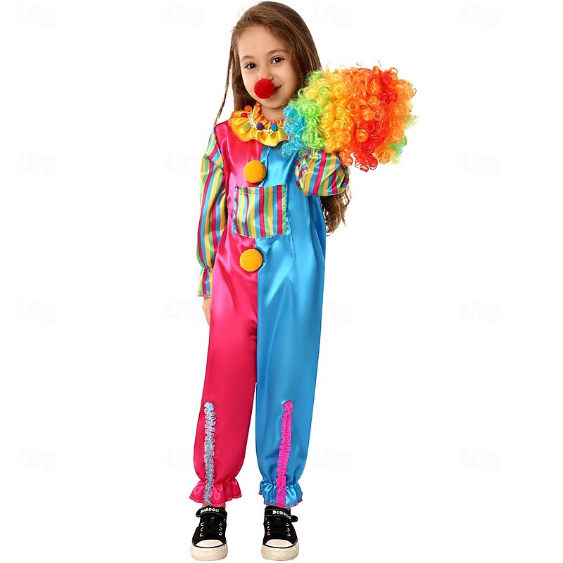 Highlights [Fabric] : Crafted from smooth, high-quality polyester, this clown costume ensures comfort and durability for active children, making it perfect for hours of playful fun. [Fit] : The traditional jumpsuit style features elasticated cuffs at the wrists and ankles, providing an easy fit that accommodates movement while maintaining a whimsical appearance. [Design Highlights] : This vibrant costume boasts a delightful mix of bold pink and blue panels with playful striped patterns on the sleeves and pocket. It is embellished with large, fun pom-poms on the front and colorful lace detailing. The ensemble includes a matching rainbow wig and a plush red clown nose, completing the lively look. [Occasions] : Ideal for performances, parties, and festive occasions such as Halloween, Carnival, and Mardi Gras. This eye-catching costume makes your child the standout character in any joyful event, embodying the spirit of fun and festivity. [Size Range] : Available in sizes S, M, L, and XL, this costume is designed to fit a variety of children's age groups, ensuring a perfect match for any aspiring little performer. Perfect for everyday use. first-class materials and excellent craftsmanship ensure long-lasting durability.