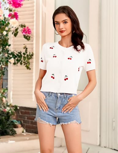 • Features: Short sleeve, crew neck, button down, cute cherries embroidery, crochet fabric. This women's sweater cardigan creates a casual and cute look while still being professional, and the cherries pattern adds vintage style and trend to this cardigan