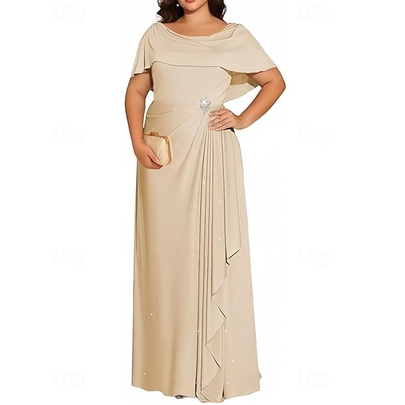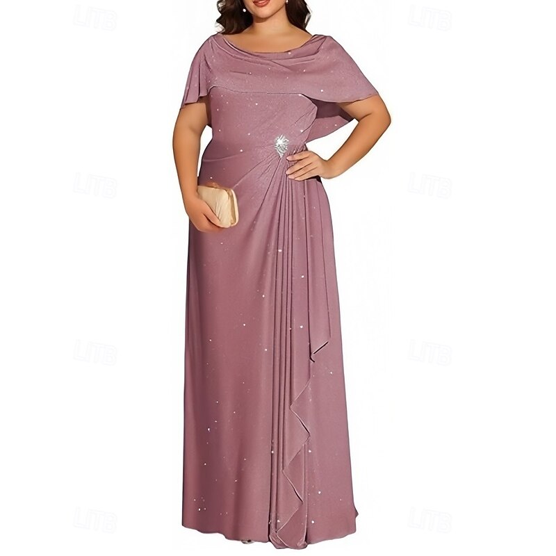A-Line Wedding Guest Dresses Elegant Dress Wedding Guest Engagement Floor Length Short Sleeve Crew Neck Lurex Fabric with Pleats Crystals 15