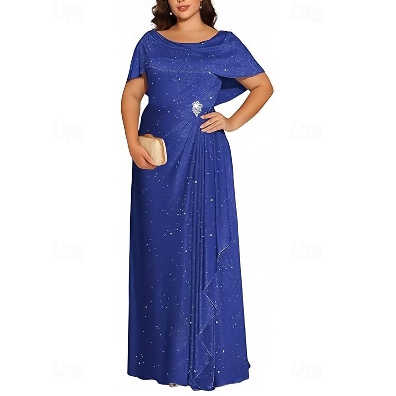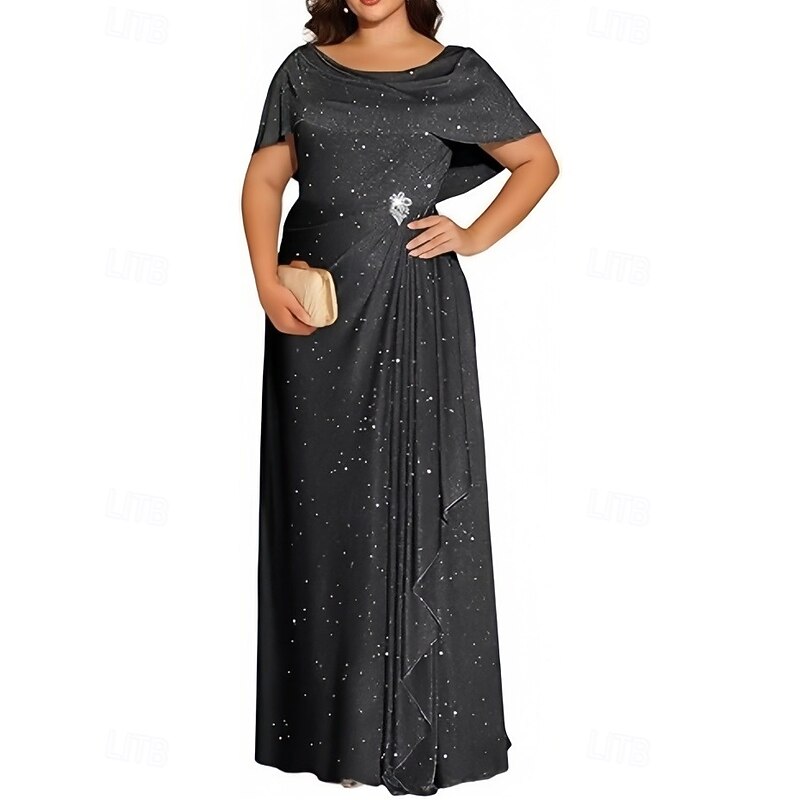 HOT ! A-Line Wedding Guest Dresses Elegant Dress Wedding Guest Engagement Floor Length Short Sleeve Crew Neck Lurex Fabric with Pleats Crystals