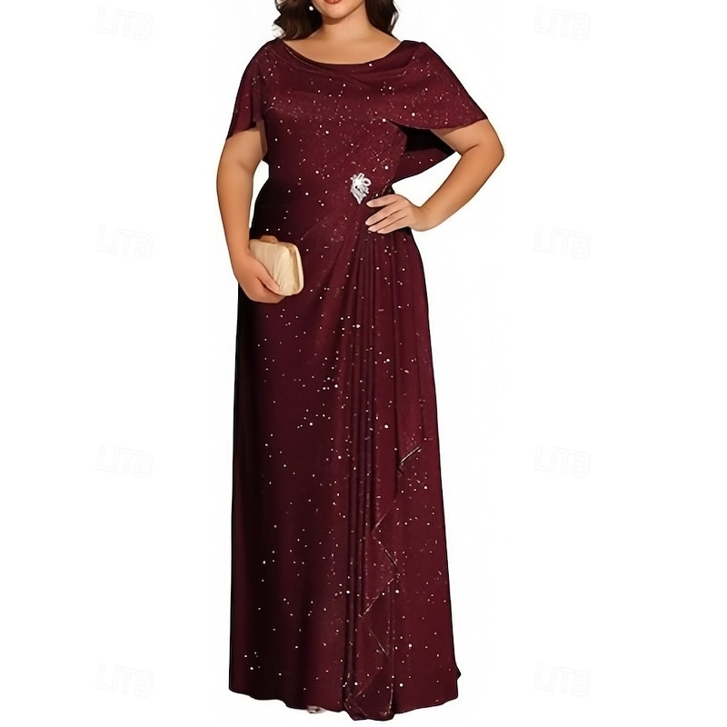 A-Line Wedding Guest Dresses Elegant Dress Wedding Guest Engagement Floor Length Short Sleeve Crew Neck Lurex Fabric with Pleats Crystals 11