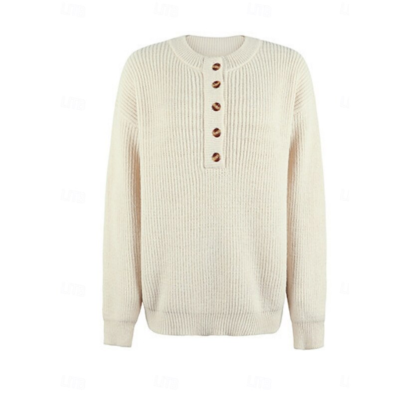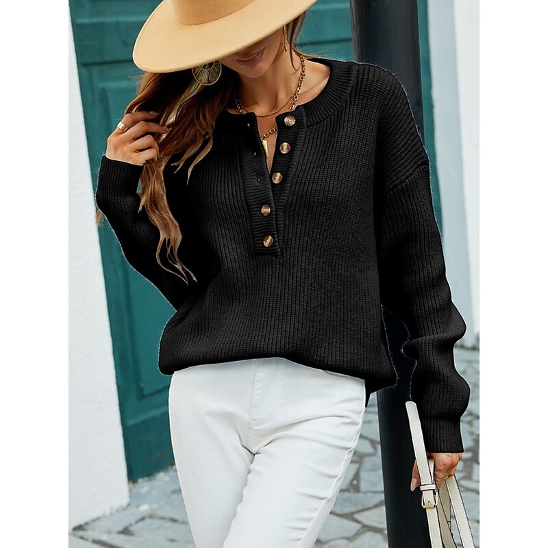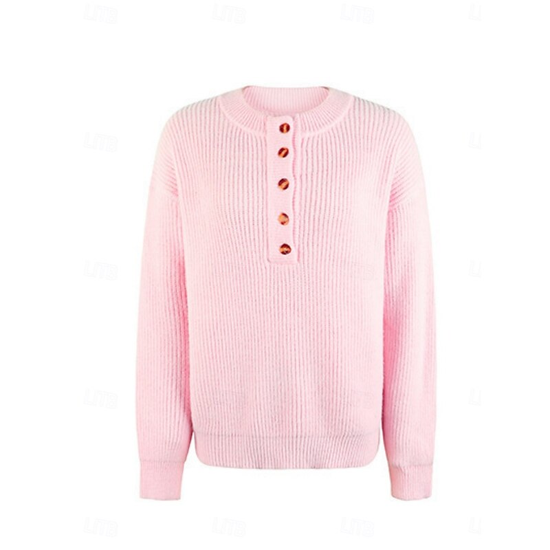 HOT ! Women's Sweater Casual Soft Pure Color Ribbed Crew Neck Buttons Knitted Long Sleeve Regular Tops Knit Outdoor Daily Weekend Black Pink Fall Winter