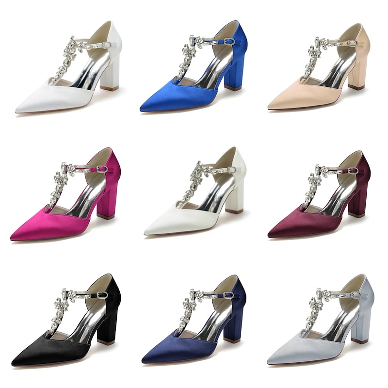 Highlights [Fabric] : Crafted from luxurious satin, these women's wedding shoes exude elegance and sophistication. The smooth, satin finish provides a refined appearance that is perfect for formal occasions. [Design] : The shoes feature a classic pointed toe design that elongates the leg line, adding a sleek and elegant touch. The T-strap style is embellished with glittering rhinestones that catch the light beautifully, ensuring all eyes are on you. The chunky block heels provide both height and stability, making these shoes comfortable for long wear, while the buckle closure ensures a secure fit. [Design Highlights] : These pumps are adorned with sparkling rhinestone embellishments along the T-strap, adding a touch of glamour and sophistication. The chunky heel provides comfort and stability, making them suitable for hours of celebration. [Occasions] : Ideal for weddings, galas, and other formal events, these luxurious bridal shoes add a glamorous touch to any outfit. Whether walking down the aisle or attending a sophisticated evening gathering, they are the perfect choice for adding charm and elegance to your ensemble. [Size] : Available in a range of sizes from 36 to 43, these shoes cater to a wide variety of foot sizes, providing a perfect fit for every bride or guest seeking elegance and style.