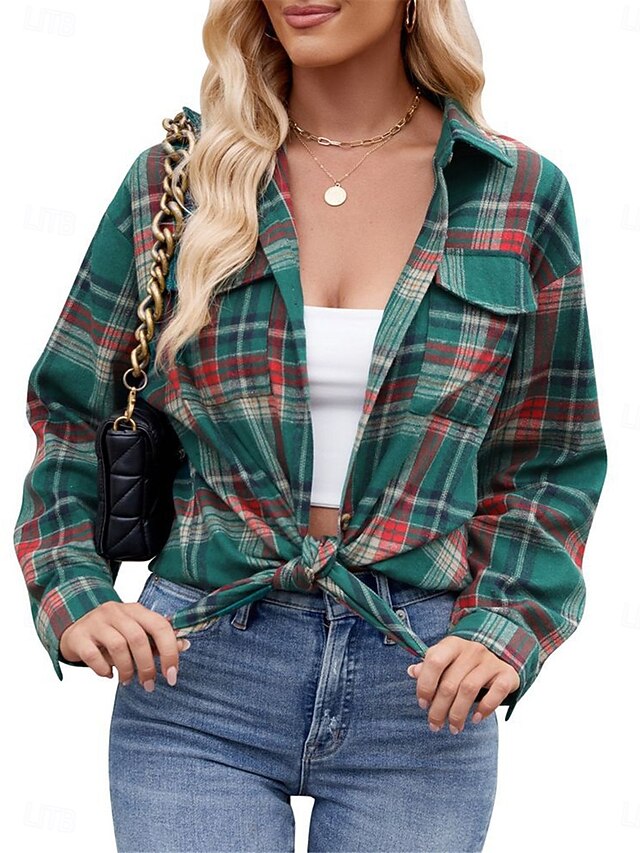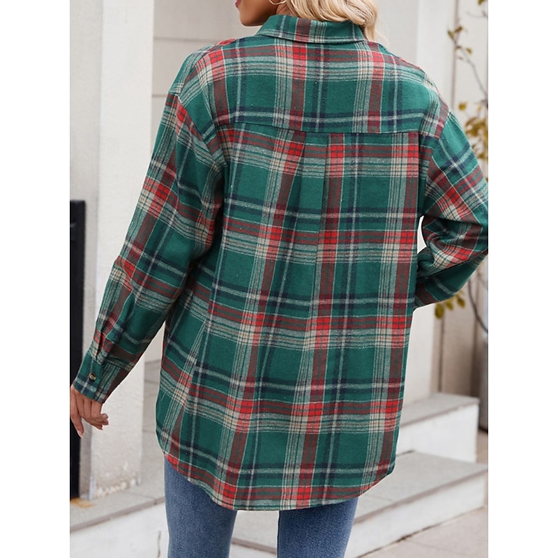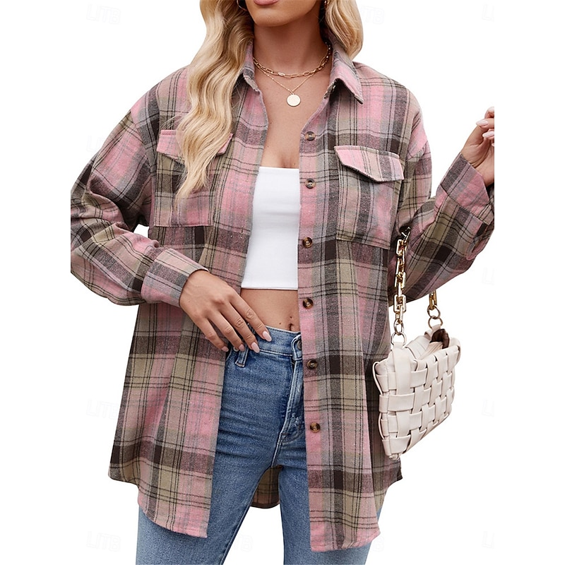 Women's Casual Jacket Outdoor Street Daily Wear Fall Winter Regular Coat Regular Fit Thermal Warm Breathable Stylish Casual Jacket Long Sleeve Stripes and Plaid with Pockets Print Pink Red Orange