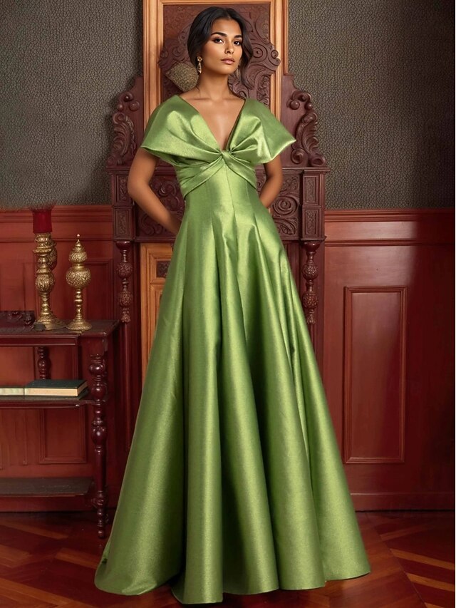 A-Line Evening Gown Elegant Dress Formal Wedding Floor Length Off Shoulder V Neck Stretch Satin with Pocket 1