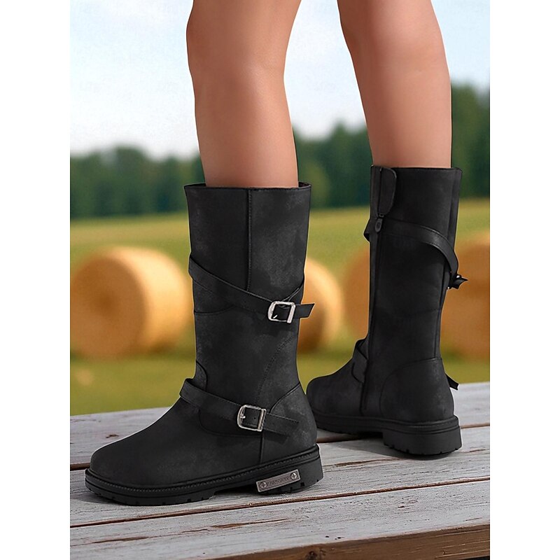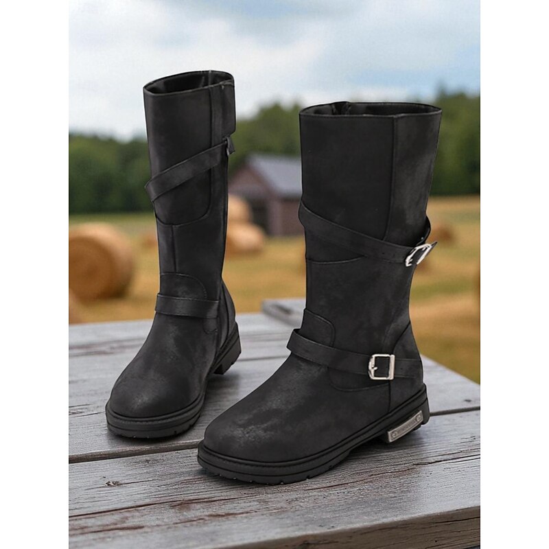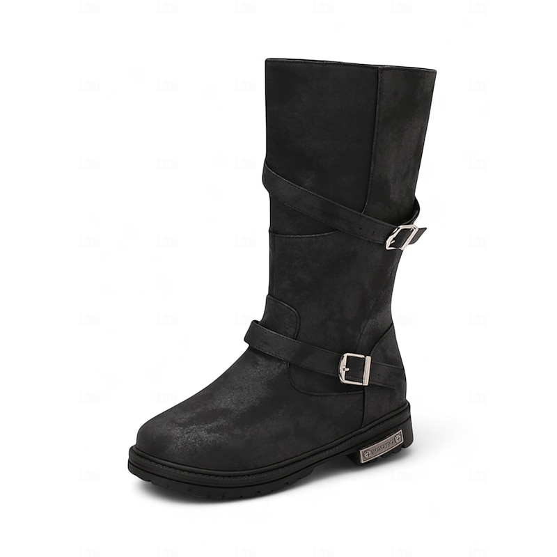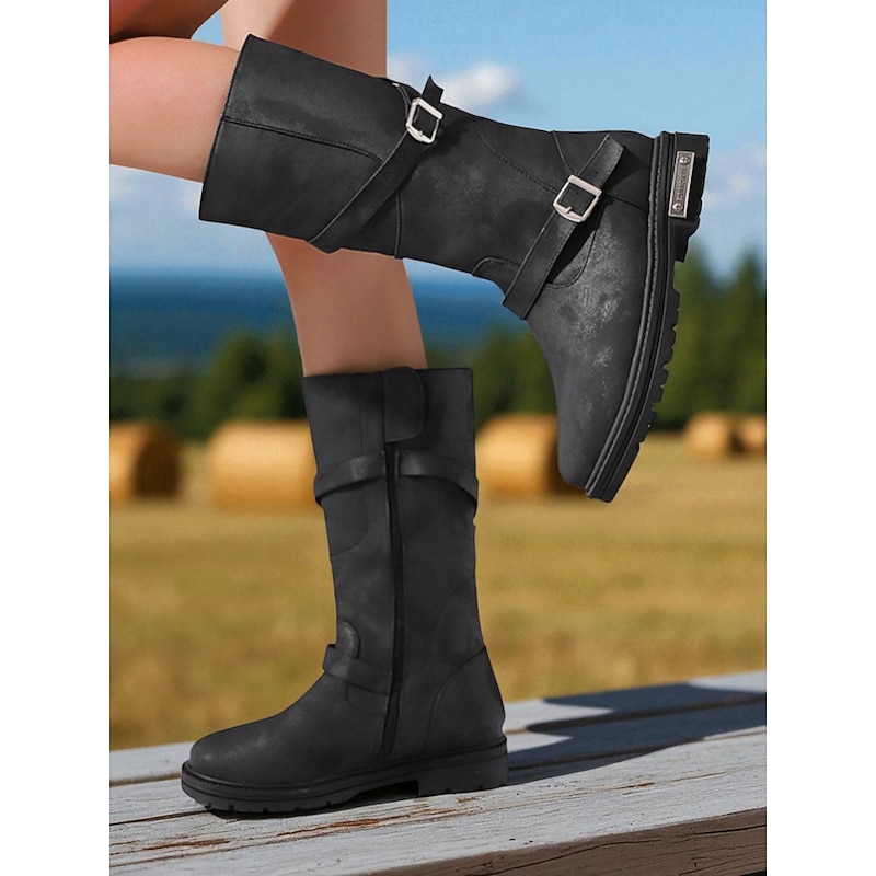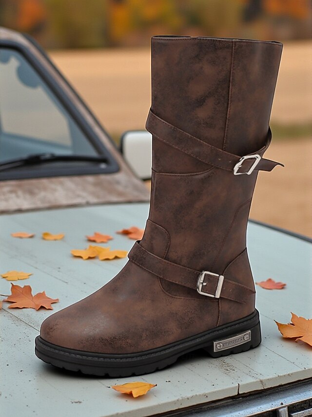 HOT ! Women's Brown Mid-Calf Boots – Distressed Faux Leather, Dual Buckle Straps, Rugged Casual Outdoor Footwear