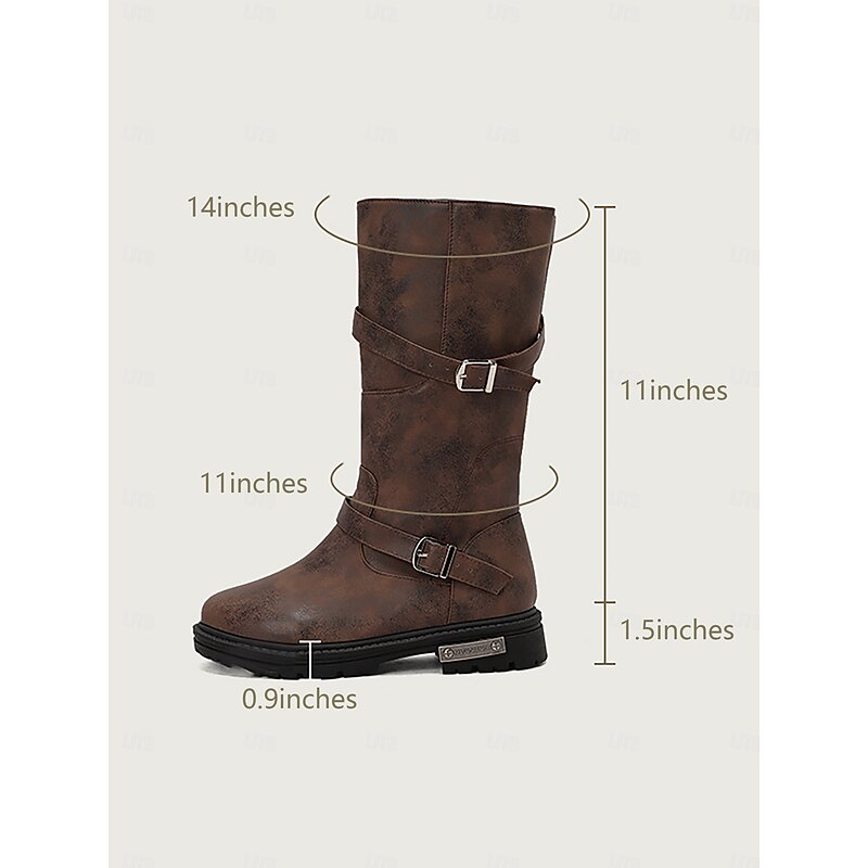 Women's Brown Mid-Calf Boots – Distressed Faux Leather, Dual Buckle Straps, Rugged Casual Outdoor Footwear 11