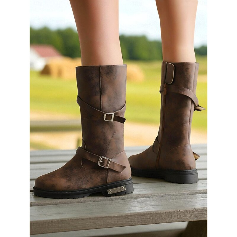 Women's Brown Mid-Calf Boots – Distressed Faux Leather, Dual Buckle Straps, Rugged Casual Outdoor Footwear 1