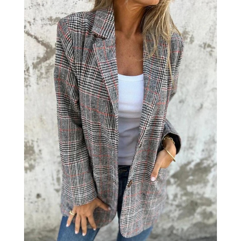 HOT ! Women's Blazer Comfortable Pocket Fashion Houndstooth Work Street Single Breasted Regular Turndown Regular Fit Long Sleeve Outerwear Brown Gray Fall Winter